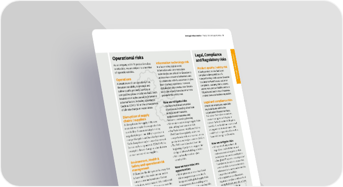 Product quality / safety risk A faulty product or one that is not compliant with regulations or is non-performing could expose Givaudan to consumer health issues, customer complaints, warranty claims, returns and re-runs, product liability claims or litigation and lead to loss of revenues, market share and business reputation. Legal and compliance risks Should our employees, especially key individuals within the organisation (Board members, Executive Committee members, senior management) display or tolerate behaviour that is illegal or unethical, or should our contractual arrangements be inadequate, this could lead to reputational as well as financial damage to Givaudan. How we mitigate risks • We systematically evaluate all ingredients for both human and environmental safety prior to their inclusion in our raw material palette • Our global IT systems control product formulations in order to ensure that raw materials are used as intended when products are manufactured in our production facilities • We regularly assess Givaudan’s legal and compliance risks at local and global levels and take actions to mitigate these risks in collaboration with the different compliance functions. How we turn risks into opportunities • We have rigorous product safety and quality programmes • We support, and in many cases lead, industry-wide programmes of the respective industry associations. As a company with 79 production sites worldwide, we are subject to a number of operational risks. Operations A breakdown of our operations may threaten our ability to produce and deliver quality products/services at competitive prices on a timely basis. Such breakdown may be caused by internal or external factors, including a pandemic (such as COVID-19) or the consequences of climate change or water stress. Disruption of supply chains / suppliers A disruption in the supply of the raw materials we require for our production or volatility of raw material prices may negatively impact our ability to produce at competitive prices and in a timely manner. Such disruption may be caused by external factors such as a pandemic (COVID-19, for example), climate change or a breakdown at one or more of our suppliers. Environment, Health & Safety and operational risk management If Givaudan should operate in a way that is harmful to the environment and/or causes community nuisance (odour emissions, waste water), this could result in fines, reputational impact or even the loss of the Company’s licence to operate. Information technology risk In a fast moving digital world, information and communication technologies are critical for Givaudan to address new consumer behaviours and to collaborate with its customers to give them the best experience. However, digitalisation also creates new threats and cyber attacks have become more prevalent the world over. How we mitigate risks • We have instituted a number of processes including structural architectural measures, behavioural measures and business continuity planning • We monitor and manage supply chain risks arising from raw materials • Our Environment, Health and Safety (EHS) function regularly carries out comprehensive risk assessments at our production and major commercial sites • The EHS team is involved from the beginning of projects to support the design of all new building activities • We continually monitor cyber security risks. How we turn risks into opportunities • We implement a cross-functional risk management process that is integrated with global supply chain management thus enabling us to mitigate raw materials sourcing risks • We developed visual risk portfolios to show mitigation measures and progress on improvement actions. • We successfully installed a number of new technologies for environmental protection in the area of odour emissions control. Operational risks Legal, Compliance and Regulatory risks • We use green chemistry and techniques such as biocatalysis to make products high in purity and yield • We work on ‘side-stream valuation’ enabling us to use a larger part of the existing raw material • We carry out risk assessments to develop water mitigation action plans, including efficiency improvements and water reuse opportunities. Givaudan – 2021 Integrated Annual Report Strategic value creation Tr ends, risks and opportunities 31 Strategic value creation