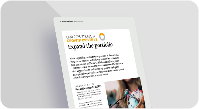 OUR 2025 STRATEGY GROWTH DRIVER # 1 Expand the portfolio We’re expanding our traditional portfolio of flavours and fragrances, naturals and delivery systems into nutrition, food ingredients and beauty. This broader offering helps customers better respond to consumer demand for products that support health and wellbeing, positive ageing and changing lifestyles while meeting their expectations around ethical and responsible business issues. OUR STRATEGY IN ACTION Key achievements in 2021 • Expanding our offerings for the consumer- packaged goods and luxury segments with the acquisition of 25% of B.Kolormakeup & Skincare of Italy (b.kolor). • Introduced Blossom Lab™, a fully equipped mobile laboratory to help create naturals extraction techniques directly in the field. • Acquired DDW, The Color House. This will reinforce our ability to create multi-sensorial food experiences with our customers and enables us to become the number two global player in natural colours. • We advanced the development of numerous biotechnology-based ingredients with external partners. A key ingredient, developed with Manus bio, will be launched in early 2022. Givaudan – 2021 Integrated Annual Report 20 Strategic value creation Ex pand the portfolio