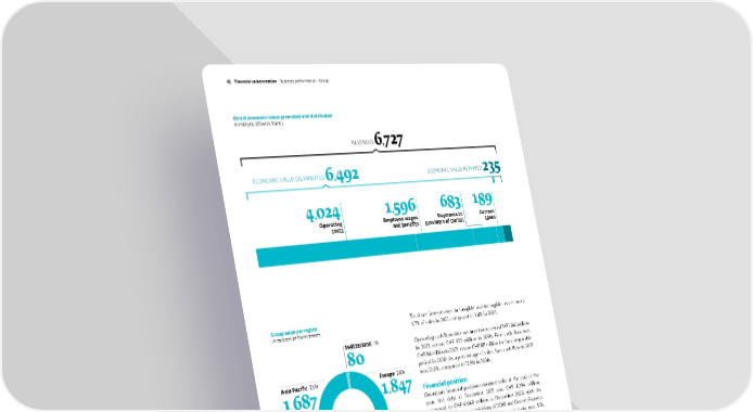 Total net investments in tangible and intangible assets were 3.7% of sales in 2021, compared to 3.4% in 2020. Operating cash flow after net investments was CHF 1,041 million in 2021, versus CHF 972 million in 2020. Free cash flow was CHF 84 million in 2021, versus CHF 811 million for the comparable period in 2020. As a percentage of sales, free cash flow in 2021 was 12.6%, compared to 12.8% in 2020. Financial position Givaudan’s financial position remained solid at the end of the year. Net debt at December 2021 was CHF 4,394 million, compared to CHF 4,040 million at December 2020, with the increase driven by the acquisitions of DDW and Custom Essence. At the end of December 2021 the leverage ratio was 51%, compared to 50% at the end of 2020. The net debt to EBITDA ratio was 2.97, compared to 2.89 at December 2020. Value added statement The value added is defined as the value created by the activities of our business and its employees. Givaudan’s economic value retained of CHF 235 million is the revenue of CHF 6,727 generated less the economic value of CHF 6,492 distributed to stakeholders through operating costs, employee wages and benefits, payments to providers of capitals and taxes. Direct economic value generated and distributed in millions of Swiss francs 4,024 Operating costs Europe 28% 1, 847 Africa and Middle- East 8% 522 North America 27 % 1, 824 Latin America 11% 724 Asia Pacific 25% 1, 687 Switzerland 1% 80 REVENUES 6, 727 1 8 9 Current taxes 6 8 3 Payments to providers of capital 1 , 596 Employee wages and benefits ECONOMIC VALUE RETAINED 235 Group sales per region in millions of Swiss francs ECONOMIC VALUE DISTRIBUTED 6, 492 Givaudan – 2021 Integrated Annual Report 42 Financial value creation Bu siness performance – Group