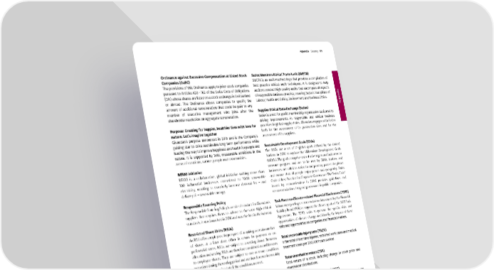 Appendix Ordinance against Excessive Compensation at Listed Stock Companies (OaEC) The provisions of this Ordinance apply to joint-stock companies pursuant to Articles 620 – 76 2 of the Swiss Code of Obligations (OR) whose shares are listed on a stock exchange in Switzerland or abroad. The Ordinance allows companies to specify the amount of additional remuneration that could be paid to any member of executive management who joins after the shareholder resolution on aggregate remuneration. Purpose: Creating for happier, healthier lives with love for nature. Let’s imagine together Givaudan’s purpose announced in 2019 and is the Company’s guiding star to drive sustainable long-term performance while leading the way to improve happiness and health for people and nature. It is supported by bold, measurable ambitions in the areas of creations, nature, people and communities. RE100 initiative RE100 is a collaborative, global initiative uniting more than 100 influential businesses committed to 100% renewable electricity, working to massively increase demand for – and delivery of – renewable energy. Responsible Sourcing Policy The Responsible Sourcing Policy is a code of conduct for Givaudan’s suppliers that requires them to adhere to the same high ethical standards. It was launched in 2016 and was the first in the industry. Restricted Share Units (RSUs) An RSU offers employees the prospect of acquiring a certain number of shares at a later date, either in return for payment or on preferential terms. RSUs are subject to a vesting clause. Between allocation and vesting, RSUs are therefore considered as entitlements to employee shares. They are subject to one or more conditions precedent during the vesting period and are therefore not irrevocably vested until the vesting date if the conditions are met. Sustainability Accounting Standards Board (SASB) SASB Standards are available for 77 industries and guide the disclosure of financially material sustainability information by companies to their investors. In 2021, the SASB organization merged together with the IIRC into the Value Reporting Foundation. Science Based Targets (SBTs) The Science Based Targets initiative is a collaboration between CDP, the United Nations Global Compact (UNGC), World Resources Institute (WRI), and the World Wide Fund for Nature (WWF), and is one of the We Mean Business Coalition commitments. The initiative enables companies to set targets in line with the 2015 Paris Agreement of limiting global warming to a maximum of 2°C and transitioning to a low-carbon economy. Sedex Members Ethical Trade Audit (SMETA) SMETA is an audit methodology that provides a compilation of best practice ethical audit techniques. It is designed to help auditors conduct high quality audits that encompass all aspects of responsible business practice, covering Sedex’s four pillars of Labour, Health and Safety, Environment and Business Ethics. Supplier Ethical Data Exchange (Sedex) Sedex is a not-for-profit membership organisation dedicated to driving improvements in responsible and ethical business practices in global supply chains. Givaudan engages with Sedex both for the assessment of its production sites and for the assessment of its suppliers. Sustainable Development Goals (SDGs) The SDGs are a set of 17 global goals defined by the United Nations in 2016 to replace the Millennium Development Goals (MDGs). The goals comprise several sub-targets and indicators to measure progress and are to be met by 2030. Nations and businesses are called to action to end poverty, protect the planet and ensure that all people enjoy peace and prosperity. Swiss Code of Best Practice for Corporate Governance The ’Swiss Code’ issued by economiesuisse in 2006 provides guidelines and recommendations for good governance in public companies. Task Force on Climate-related Financial Disclosures (TCFD) Voluntary reporting recommendations introduced by the Financial Stability Board (FSB) to support the climate goals of the 2015 Paris Agreement. The TCFD seeks to present the specific risks and opportunities of climate change and identify the impact of these risks and opportunities on companies and financial markets. Total recordable injury rate (TRCR) Is the total of lost time injuries, restricted work cases and medical treatment cases per 200,000 hours worked. Total shareholder return (TSR) Total return of a stock, including change in stock price and shareholder distributions. United Nations Global Compact (UNGC) The UNGC is a strategic policy initiative for businesses that are committed to aligning their operations and strategies with 10 universally accepted principles in the areas of human rights, labour, environment and anti-corruption. Value Reporting Foundation In 2021, the IIRC and SASB merged together to create the Value Reporting Foundation: a global nonprofit organisation that offers a comprehensive suite of resources designed to help businesses and investors. Givaudan – 2021 Integrated Annual Report Appendix Gl ossary 171