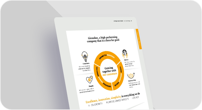 Givaudan, a high performing company that is a force for good Nature We show our love for nature through impactful actions Creations We create inspiring solutions for happier, healthier lives Communities We bring benefits to all communities that work with us People We nurture a place where we all love to be and grow Excellence, innovation, simplicity in everything we do 4 – 5% GROWTH PU RPOSE LINKED TARGETS > 12 % FCF ESG fully integrated in our 2025 strategy E nvironment S ocial G overnance Growing together with our customers Givaudan 2021 Integrated Annual Report Strategic value creation Ou r 2025 strategy 19 Strategic value creation