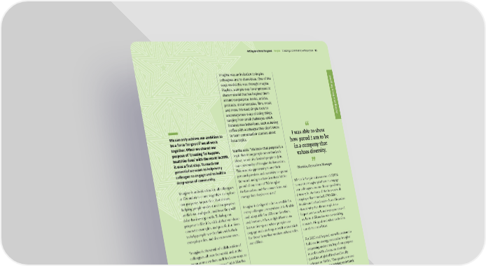 With Imagine Live I feel involved in the future. I feel that I can make a difference and contribute to the bigger picture. Sabine, Operations Management Trainee I was able to show how proud I am to be in a company that v a lu e s d ive r s it y. Olumide, Operations Manager Imagine was an invitation to inspire colleagues and to share ideas. One of the ways we did this was through Imagine Playlists, a simple way for employees to share material that has inspired them around our purpose: books, articles, podcasts, documentaries, films, music and more. We used simple tools to encourage new ways of doing things, ranging from small challenges which fostered new behaviours, such as having coffee with a colleague they didn’t know, to team conversation-starters about focus topics. Martha adds: “We know that purpose is a topic that many people are enthusiastic about, so we also invited people to join our community of Imagine Ambassadors. This was an opportunity to use their personal passions and creativity to spread the word and get others involved. We’re proud of our team of 150 Imagine Ambassadors and the connections and energy that they’ve created.” Imagine is designed to be accessible for every colleague, everywhere. It is flexible and adaptable for different timelines and formats. It has a digital home, an interactive space where people can engage and catch up as well as materials for those front-line workers whose roles are offline. We took the pivotal moment of COP26 to use the Imagine platform to engage our colleagues on our climate positivity journey. In the form of the first-ever all employee live townhall, CEO Gilles Andrier and other leaders from Givaudan shared why the climate topic is so important to each and everyone one of us, how at Givaudan we are working towards this goal and what each of us can do to contribute. For 2022 and beyond, we will continue to build on the energy created by Imagine deepening understanding of our purpose in action with a focus on strategic priorities at global level and locally relevant activities. “Our goal is to move towards our purpose being an intrinsic lens for decision making, actions and behaviours at every level of the business, with local ownership and global impact,” Martha concludes. Contributing to the United Nations Sustainable Development Goals (SDG) We can only achieve our ambition to be a force for good if we all work together. When we shared our purpose of ‘Creating for happier, healthier lives’ with the world in 2019, it was a first step. To reach our potential we want to help every colleague to engage and to build a deep sense of community. Imagine is an invitation for all colleagues at Givaudan to come together to explore our purpose. In practice, that means helping people understand our purpose, ambitions and goals, and how they will drive business growth. To bring our purpose to life, it is critical that we share concrete examples and practical actions to help people see the links with their everyday roles and discover new ones. “Imagine is the result of collaboration of colleagues all over the world, and as the programme evolves we’ll find new ways to help us all live our purpose,” adds Martha. We took the opportunity of new, virtual ways of working to invite colleagues to co-create the programme. More than 150 employees took part in its development, suggesting stories, examples and different ways to bring our purpose to life. By running the programme on a virtual platform we had the advantage that more people could attend, bringing together colleagues from all countries and roles. The virtual approach also allowed us to cross language barriers, translating the content into the 18 most commonly spoken languages at Givaudan. Givaudan – 2021 Integrated Annual Report Acting as a force for good Acting as a force for good Pe ople Cr eating a community with purpose 93