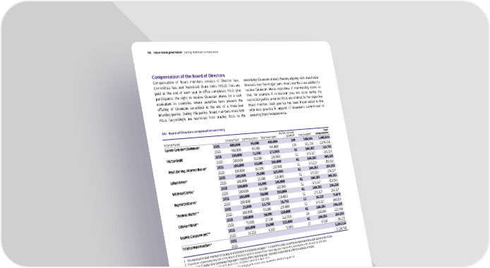 Compensation of the Board of Directors Compensation of Board members consists of Director fees, Committee fees and Restricted Share Units (RSUs). Fees are paid at the end of each year in office completed. RSUs give participants the right to receive Givaudan shares (or a cash equivalent in countries where securities laws prevent the offering of Givaudan securities) at the end of a three-year blocking period. During this period, Board members must hold RSUs (accordingly are restricted from trading RSUs or the underlying Givaudan shares), thereby aligning with shareholder interests over the longer term. Board members are entitled to receive Givaudan shares regardless of membership status so that, for example, if re-election does not occur during the restriction period, awarded RSUs are retained by the respective Board member. Such practice has been implemented in line with best practice in support of Givaudan’s commitment to ensuring Board independence. The compensation paid to the Board members for the period between the 2020 and 2021 Annual General Meetings, CHF 3,280,206, is again within the amount approved by shareholders at the 2020 Annual General Meeting CHF 3,400,000. Amounts approved at the 2021 Annual General Meeting CHF 3,250,000 will be paid by the end of the year in office and validated in the 2022 Compensation report. Such approved and paid amounts may differ from those shown in the Board compensation summary table which, according to the OaEC, must include compensation paid in the reporting year. XIV. Board of Directors compensation summary in Swiss francs Director fees ³ C ommittee fees ³ T otal fixed (cash) Number of RSUs granted ⁴ V alue at grant ⁵ Tot al compensation Calvin Grieder Chairman ¹ 2021 400,000 65,000 465,000 169 580,566 1,045,566 2020 400,000 65,000 465,000 208 581,256 1,046,256 Victor Balli ¹ 2021 100,000 72,500 172,500 42 144,283 316,783 2020 100,000 50,000 150,000 52 145,314 295,314 Prof. Dr-Ing. Werner Bauer ¹ 2021 100,000 65,000 165,000 42 144,283 309,283 2020 100,000 65,000 165,000 52 145,314 310,314 Lilian Biner ¹ 2021 100,000 25,000 125,000 42 144,283 269,283 2020 100,000 25,000 125,000 52 145,314 270,314 Michael Carlos ¹ 2021 100,000 65,000 165,000 42 144,283 309,283 2020 100,000 65,000 165,000 52 145,314 310,314 Ingrid Deltenre ¹ 2021 100,000 50,000 150,000 42 144,283 294,283 2020 100,000 50,000 150,000 52 145,314 295,314 Thomas Rufer ¹, ⁶ 2021 25,000 13,750 38,750 13 36,329 75,079 2020 100,000 55,000 155,000 52 145,314 300,314 Olivier Filliol ¹,⁷ 2021 100,000 50,000 150,000 42 144,283 294,283 2020 75,000 3 7, 5 0 0 112,500 39 108,986 221,486 Sophie Gasperment ¹,⁸ 2021 100,000 25,000 125,000 42 144,283 269,283 2020 33,333 8,333 41,666 17 47, 5 0 7 89,173 Total compensation ² 2021 3,183,126 2020 3,138,799 1. The function of each member of the Board of Directors is indicated on pages 7–9 in both the 2020 Governance report and the 2021 Governance Report. 2 . Re presents total compensation of the Board of Director paid in respect of the reporting year, reported in accordance with the accrual principle. 3. Re presents Director and Committee fees paid in respect of the reporting year, reported in accordance with the accrual principle. 4. 20 21 RSUs blocking period end on 15 April 2024; 2020 RSUs end on 15 April 2023. 5. Ec onomic value at grant according to IFRS methodology with no discount applied for the blocking period. 6. Th omas Rufer retired at the AGM in March 2021. 7. Th e 2020 figures represent compensation from April to December 2020. 8. Th e 2020 figures represent compensation from September to December 2020. Estimated social security charges based on 2021 compensation amounted to CHF 263,416 (2020: CHF 259,320). Givaudan – 2021 Integrated Annual Report 130 Value-based governance Se tting incentives to create value