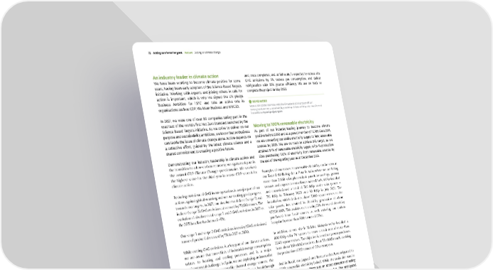 An industry leader in climate action We have been working to become climate positive for some years, having been early adopters of the Science Based Targets initiative. Working with experts and joining others in calls for action is important, which is why we signed the UN pledge ‘Business Ambition for 1.5°C’ and take an active role in organisations such as CDP, We Mean Business and WBCSD. In 2021, we were one of over 80 companies taking part in the road test of the world's first Net Zero Standard launched by the Science Based Targets initiative. As we strive to deliver on our purpose and sustainability ambitions, we know that no business can tackle the issue of climate change alone. Action depends on a collective effort, guided by the latest climate science and a shared commitment to creating a positive future. Demonstrating our industry leadership in climate action and the transition to a low-carbon economy, we again took part in the annual CDP Climate Change questionnaire. We received the highest score for the third year in a row: CDP score A for climate action. Reducing emissions of GHG in our operations is a major part of our actions against global warming and we are making good progress towards our targets. In 2021, our absolute total direct (scope 1) and indirect (scope 2) GHG emissions decreased by 75,600 tonnes. The evolution of absolute total scope 1 and 2 GHG emissions in 2021 vs the 2015 baseline has been of -31%. Our scope 1 and scope 2 GHG emissions intensity (GHG emissions/ tonne of product) decreased by 11% in 2021 vs 2020. While cutting GHG emissions is a key part of our climate actions, we are aware that two-thirds of industrial energy consumption relates to heating and cooling processes and is a major environmental challenge. In Spain, we are deploying an innovative approach to integrate renewable thermal energy sources: the HyCool project at our Sant Celoni site will use breakthrough technology by combining solar collectors with absorption chillers to harness solar energy to produce steam, heating and cooling energy with greater efficiency. Installation started in summer 2021 and, once completed, and at full scale, is expected to reduce site GHG emissions by 3%, reduce gas consumption, and deliver refrigeration with 25% greater efficiency. We are on track to complete the project in May 2022. READ MORE Have a look at the interview with the Givaudan HyCool project officer: www.givaudan.com ▸ sustainability ▸ nature ▸ climate action ▸ solar heat for cool innovation ▸ hycool project spain Moving to 100% renewable electricity As part of our industry-leading journey to become climate positive before 2050 and as a proud member of RE100 since 2015, we are converting our entire electricity supply to fully renewable sources by 2025. We are on track to achieve this target, as we attained 84% of renewable electricity supply, with 45 production sites purchasing 100% of electricity from renewable sources by the end of the reporting year as at December 2021. Examples of our moves to renewable electricity can be seen at our Taste & Wellbeing site at Pune in India, where we are fitting more than 2,000 solar photovoltaic panels to rooftops, ground mounts and carports to cut reliance on fossil fuels. We’ve installed and commissioned a total of 746 kWp onsite solar power – 716 kWp in February 2020 and 30 kWp in July 2021. The installation, which dedicates about 5,300 square metres to the solar panels, has resulted in electricity generation of about 971,520 kWh. This enables us to cut by 20% the use of electricity purchased from fossil sources as well reducing our carbon footprint by more than 900 tonnes of CO₂e. In addition, at our site in Melaka, Malaysia we’ve installed a 400 kWp solar PV system to cover a total area of more than 22,40 square metres. The objective is to reduce power purchases from about 100 mkW/month to about 55 mkW/month, avoiding the production of 332 tonnes of CO₂e every year. And in Brazil, our Jaguaré and Botucatu sites have migrated to 100% renewable electricity (wind). While the main aim was to buy renewable energy, there was an added attraction of selling the sites’ unused energy back to the market. The anticipated savings for the move to renewable electricity are CHF 750,000 over five years, with expected sales of unused energy worth more than CHF 72,000 in 2021. These innovative examples are an important part of reaching our targets. In 2020, we set a new renewable electricity strategy prioritising on-site generation, then off-site generation and then the purchase of Electricity Attribute Certificates (EACs). Our stringent procurement strategy helps add more renewable electricity to the grid and in 2021 we purchased electricity that accounted for 32% of the total energy used across the Company but which equated to 15% of our total CO₂ emissions. Our ambition is a bold one, but a n ecessary step to bring about impacts in the years to come. And we need to all work together with a positive, action-oriented mindset. Willem Mutsaerts Givaudan – 2021 Integrated Annual Report 72 Acting as a force for good Nat ure Ac ting on climate change