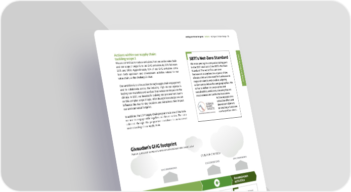 Actions within our supply chain: tackling scope 3 We are committed to reduce emissions from our entire value chain and our scope 3 target is to cut GHG emissions by 20% between 2015 and 2030. Approximately 93% of our GHG emissions come from both upstream and downstream activities related to our value chain, so the challenge is clear. Our ambition is to drive action through supply chain engagement and to collaborate across the industry. High on our agenda is buying raw materials and services that reduce our impact on the climate. In 2021, we invested in training our procurement teams on this complex scope 3 topic. With the right knowledge we can influence the day-to-day decisions and behaviours that impact our environmental footprint. In addition, the CDP Supply Chain programme is one of the tools we use to engage with suppliers on climate action. The data collected through this programme contribute to an increased understanding of our supply chain. SBTI's Net-Zero Standard We were among the companies taking part in the 2021 road test of the SBTi’s Net-Zero Standard. The world-first common framework recognises the urgency of the climate crisis and the need for businesses to respond robustly and credibly, aligning action across industries and geographies. We strive to deliver on our purpose and sustainability ambitions, knowing that no one business can tackle the issue alone. Action depends on a collective effort and shared commitment to creating a future we can be positive about. Givaudan's GHG footprint Approx. 2,300,000 tonnes GHG emissions emitted each year, scope 1, 2 & 3 GHG EMISSIONS GHG EMISSIONS GHG EMISSIONS SCOPE 3 Ot her indirect GHG Emissions Purchased goods and services 81% Capital goods 4% Fuel and energy related activities 3% Upstream transportation and distribution 2% Waste generated in operations 1% Business travel <1% Employee commuting <1% 90 % SCOPE 3 Ot her indirect GHG Emissions Downstream transportation and distribution 1 % 3 % 6 % Upstream activities Downstream activities SCOPE 1 Di rect GHG Emissions Operations SCOPE 2 En ergy indirect GHG Emissions Energy supply GHG EMISSIONS CLIMATE CHANGE GHG EMISSIONS GHG EMISSIONS Givaudan – 2021 Integrated Annual Report Acting as a force for good Nat ure Ac ting on climate change 73 Acting as a force for good