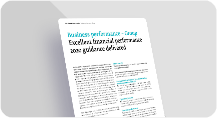 Business performance – Group Excellent financial performance 2020 guidance delivered As the COVID-19 pandemic continued to have an impact on a global level, Givaudan sustained good business momentum whilst maintaining its operations and global supply chain at a high level, despite ongoing challenges in certain parts of the supply chain. The strong sales growth was achieved across all product segments and geographies, with the mature markets growing at 6.3% and the high growth markets at 8.3% on a like- for-like basis. In Fragrance & Beauty the product segments most affected in the first phases of the COVID-19 pandemic, namely Fine Fragrances and to a lesser extent Active Beauty, delivered excellent double-digit growth in 2021, demonstrating strong consumer demand for these product categories. In Taste & Wellbeing, there was excellent sales growth in the beverage, savoury and snacks categories, as well as in the strategic focus areas of plant-based proteins, health and wellness and naturals. In addition, there was a progressive recovery in the foodservice segment, as restrictions in relation to out-of-home food and beverage consumption started to be eased in certain markets. With higher input costs in 2022, the company is implementing price increases in collaboration with its customers to fully compensate for the increases in input costs. Group sales Givaudan Group full year sales were CHF 6,684 million, an increase of 7.1% on a like-for-like basis and 5.7% in Swiss francs when compared to 2020. Gross margin The gross profit increased by 7.4% from CHF 2,659 million in 2020 to CHF 2,855 million in 2021. Due to the operating leverage related to the strong sales volume growth and continued cost discipline, the gross margin increased to 42.7% in 2021 compared to 42.1% in 2020. Earnings Before Interest, Tax, Depreciation and Amortisation (EBITDA) The EBITDA increased by 6.0% to CHF 1,482 million in 2021 compared to CHF 1,397 million in 2020, whilst the EBITDA margin was 22.2% in 2021 compared to 22.1% in 2020. On a comparable basis, the EBITDA margin was 22.5% in 2021 compared to 22.8% in 2020. Operating income The operating income was CHF 1,089 million compared to CHF 996 million, an increase of 9.3% versus 2020. The operating margin was 16.3% in 2021 compared to 15.8% in 2020. Financial performance Financing costs in 2021 were CHF 94 million versus CHF 86 million in 2020, largely related to the increase in the net debt of the Group in connection with the acquisitions that the Group has made. Other financial expense, net of income, was CHF 30 million in 2021 compared with CHF 34 million in 2020. The income tax expense as a percentage of income before taxes was 15%, compared to 15% in 2020. Net income The net income was CHF 821 million in 2021 compared to CHF 743 million in 2020, an increase of 10.5%, resulting in a net profit margin of 12.3% versus 11.8% in 2020. Basic earnings per share were CHF 89.03 compared to CHF 80.59 for the same period in 2020. 7.1 % Sales growth (like-for-like) Givaudan – 2021 Integrated Annual Report 40 Financial value creation Bu siness performance – Group
