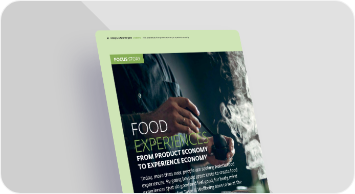 Today, more than ever, people are seeking holistic food experiences. By going beyond great taste to create food experiences that do good and feel good, for body, mind and planet, Givaudan Taste & Wellbeing aims to be at the leading edge of this movement. FOCUS STORY FOOD EXPERIENCES FROM PRODUCT ECONOMY TO EXPERIENCE ECONOMY Givaudan – 2021 Integrated Annual Report 62 Acting as a force for good Cr eations Foo d experiences: from product economy to experience economy
